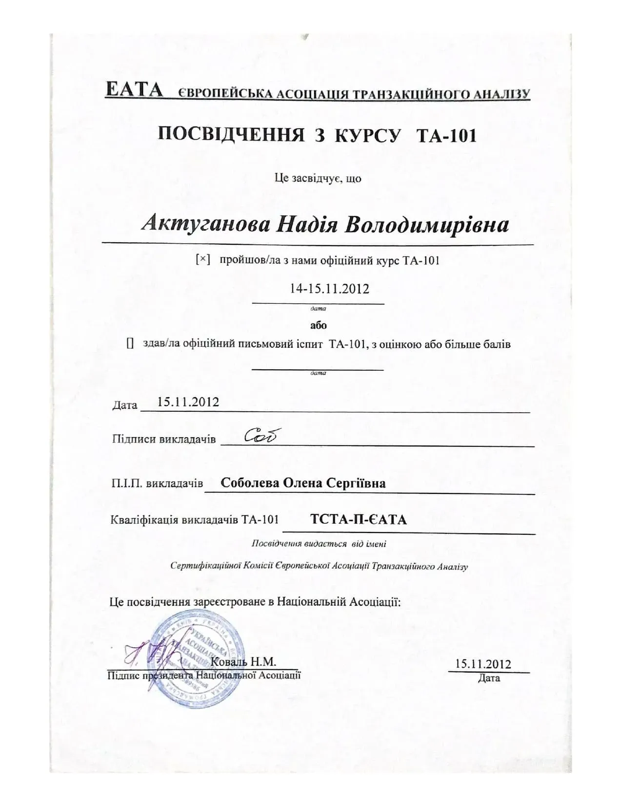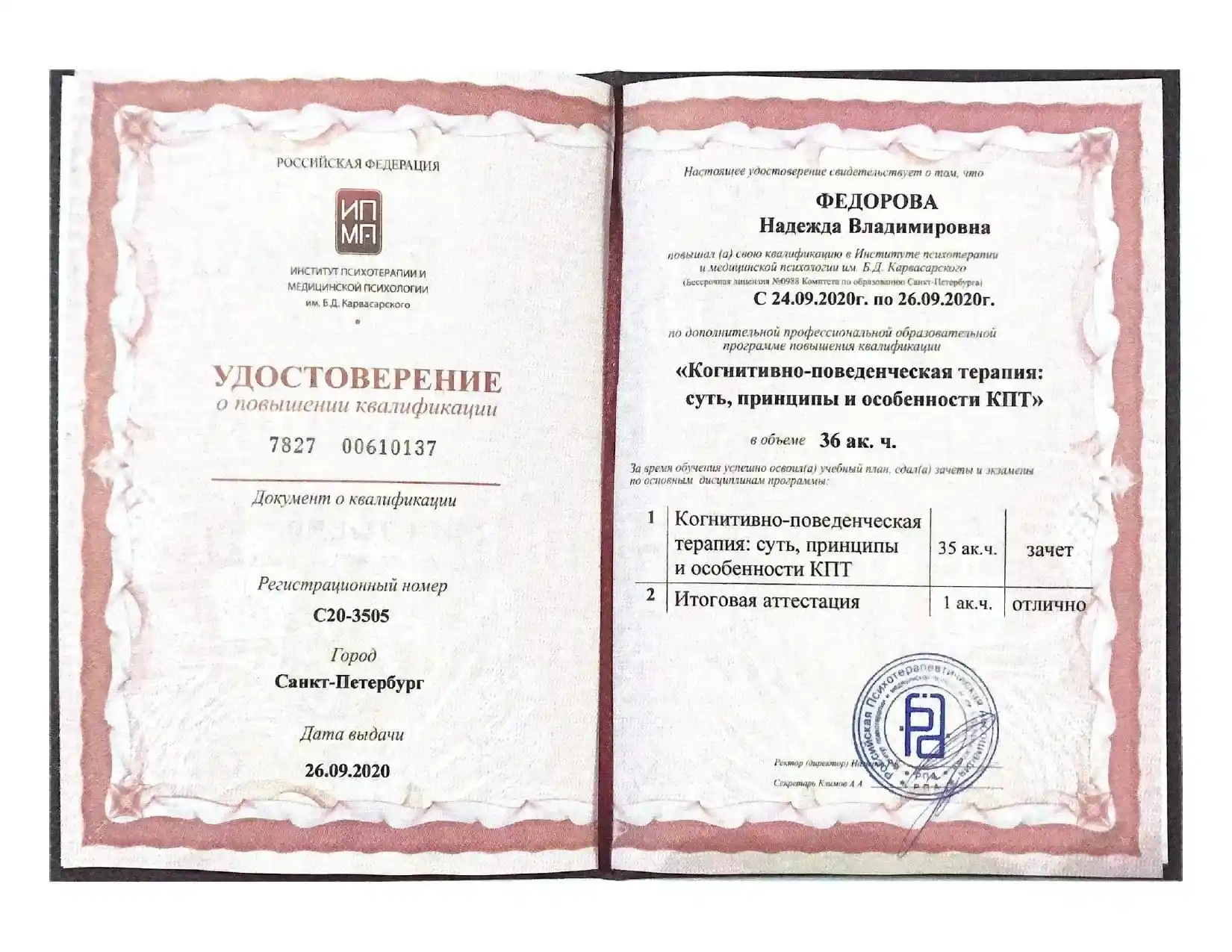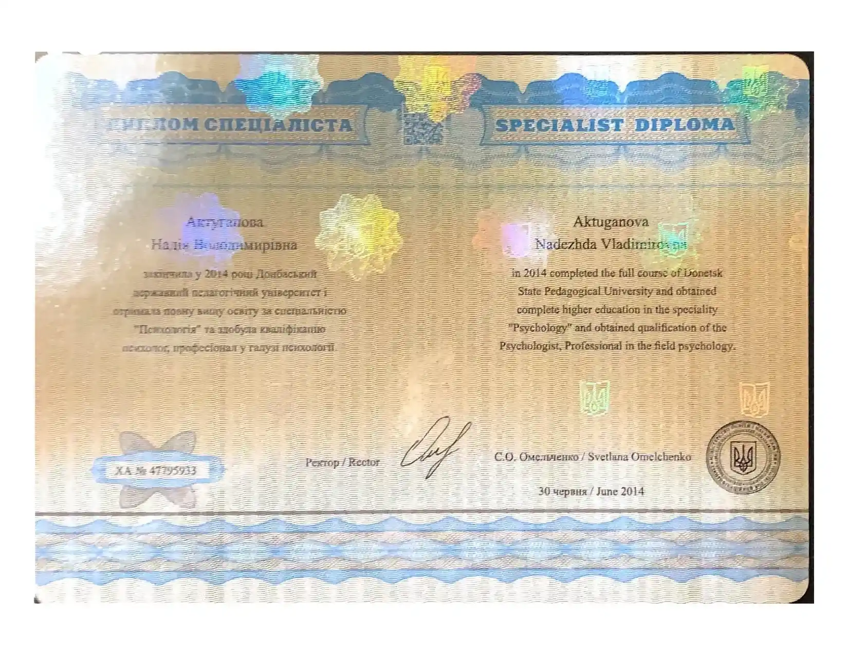 • В 2014 году получила диплом по Личностно-ориентированному уровню когнитивно-поведенческой психотерапии. Работа с когнитивными стилями и стратегиями.