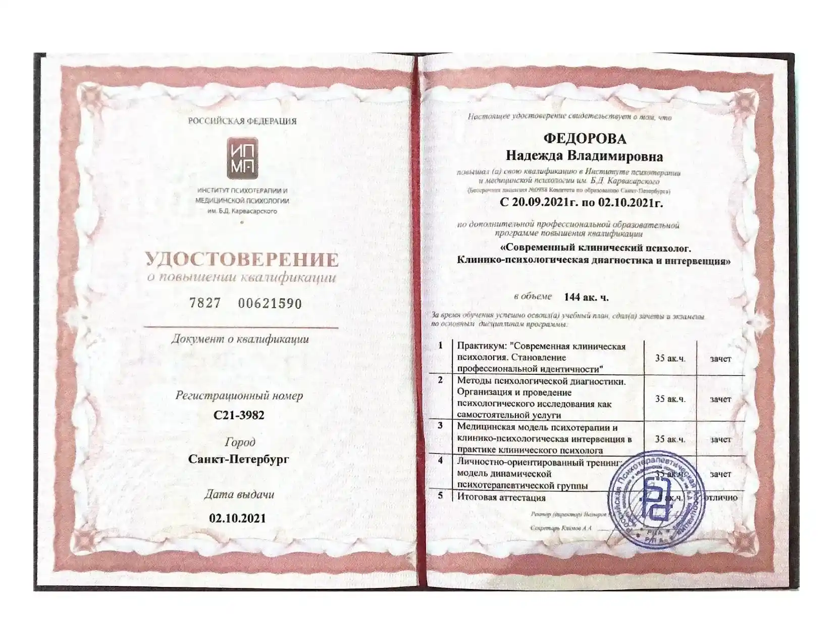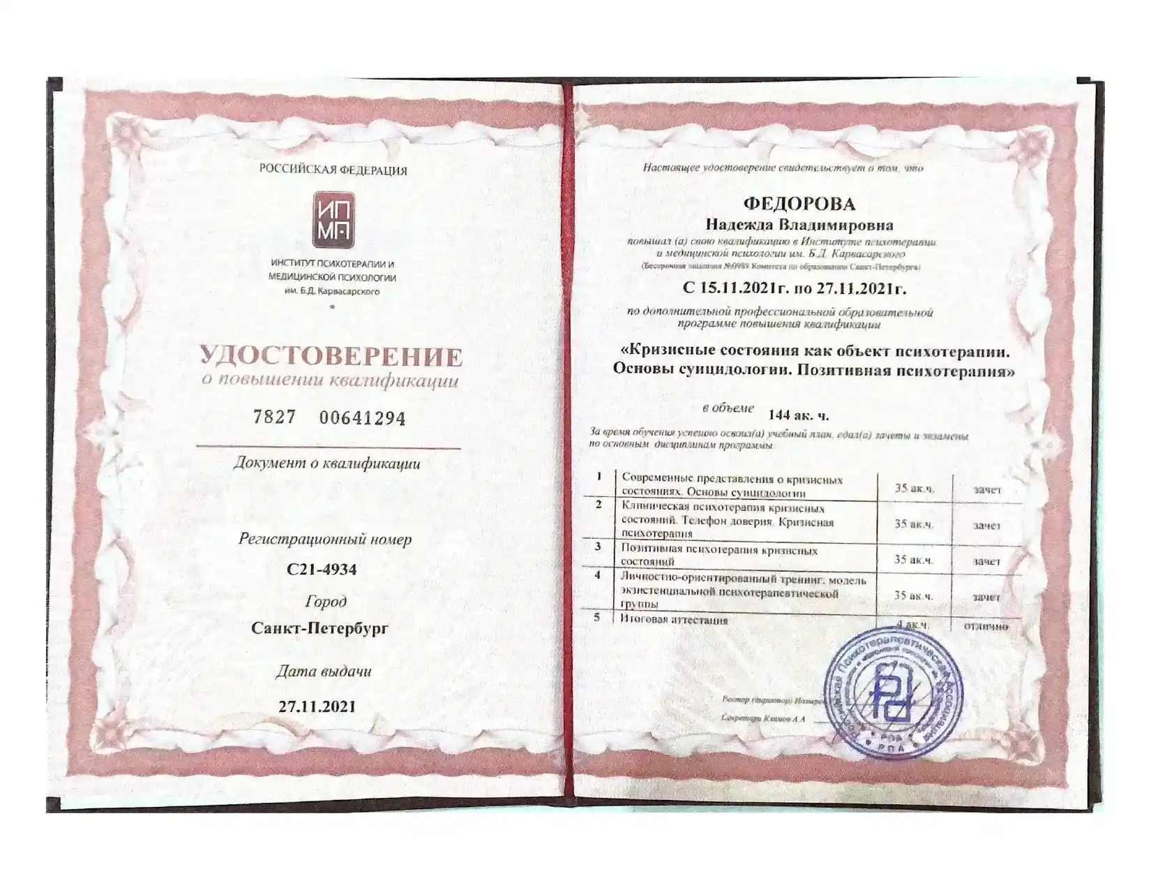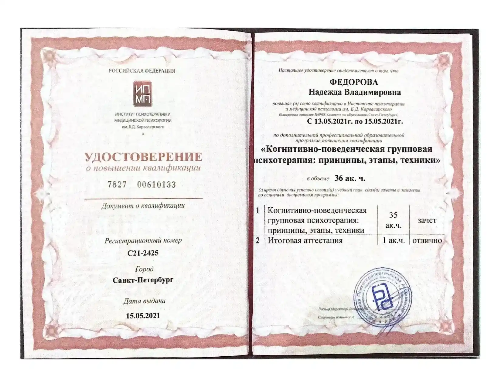 • В 2014 году получила диплом по Личностно-ориентированному уровню когнитивно-поведенческой психотерапии. Работа с когнитивными стилями и стратегиями.